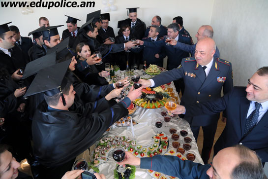 2014թ. դեկտեմբերի 25-ին ՀՀ ոստիկանության կրթահամալիրում տեղի ունեցավ կրթահամալիրի ակադեմիայի մագիստրատուրայի հեռակա ուսուցման 2014-2015 ուսումնական տարվա շրջանավարտների դիպլոմների հանձնման հանդիսավոր արարողությունը: Շրջանավարտները ծաղիկներ դրեցին ծառայողական պարտականությունների կատարման ժամանակ զոհված /մահացած/ ոստիկանության ծառայողների հուշարձանին, այնուհետև կրթահամալիրի մատուռում մոմեր վառեցին: Դիպլոմների հանձնման հանդիսավոր արարողությանը ներկա էին ՀՀ ոստիկանության կրթահամալիրի պետ, ոստիկանության գեներալ-լեյտենանտ Հովհաննես Վարյանը, ամփոփիչ պետական ատեստավորման հանձնաժողովի նախագահ, ոստիկանության ինֆորմացիոն կենտրոնի պետ, ոստիկանության գնդապետ Ա. Ղուկասյանը, կադրերի վարչության պետի տեղակալ, ոստիկանության գնդապետ Ա. Չարենցը, կրթահամալիրի պետի տեղակալները, ակադեմիայի ղեկավարությունը, ամբիոնի պետերը: Շնորհավորանքի խոսքով հանդես եկավ ոստիկանության գեներալ-լեյտենանտ Հովհ. Վարյանը, ոստիկանության գնդապետ Ա. Ղուկասյանը և ակադեմիայի պետի տեղակալ, ոստիկանության գնդապետ Գ. Գրիգորյանը: Շրջանավարտները հանդես եկան շնորհակալական խոսքով: